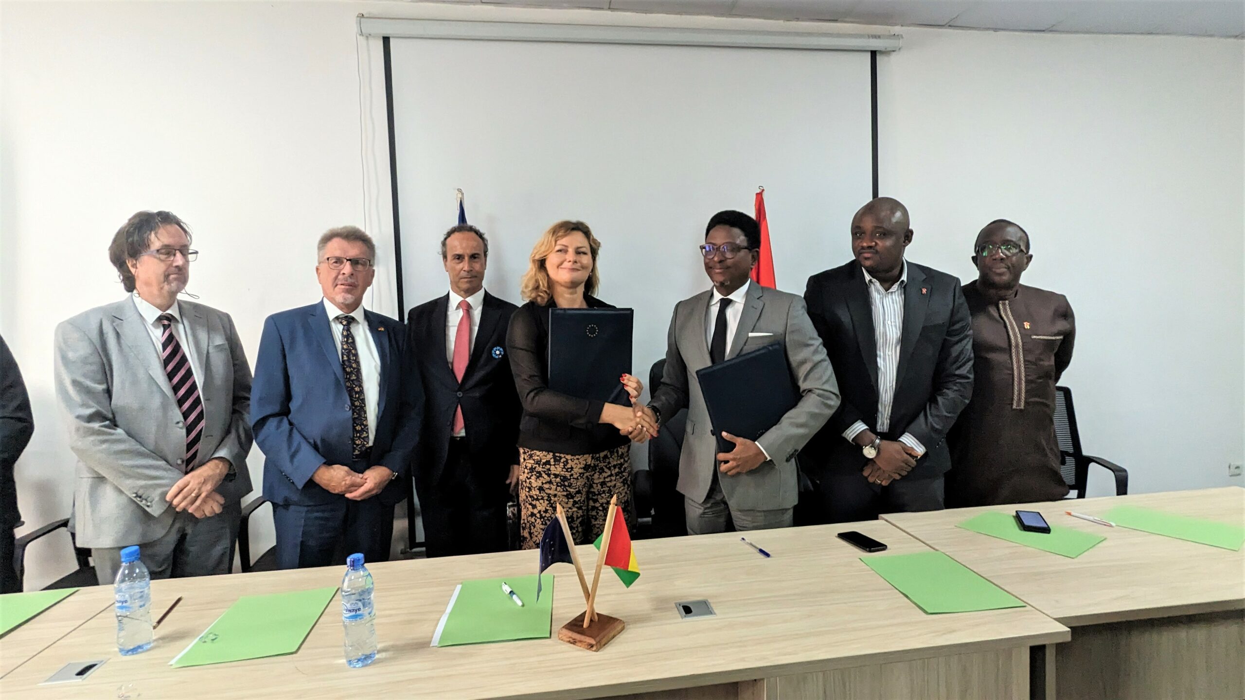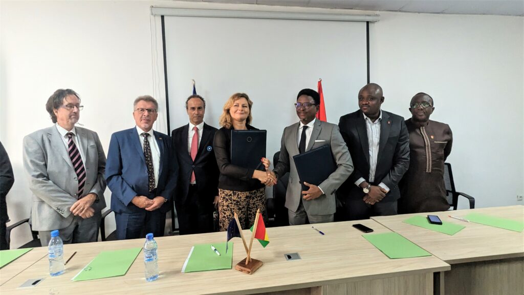 La cérémonie de signature a été présidée par le ministre de l’Enseignement Technique, la Formation Professionnelle et l’Emploi, Alpha Bacar Barry, en présence du Secrétaire Général du Ministère du Plan et de la Coopération Internationale, Dr. Mamoudou Touré, des Ambassadeurs de l’Union européenne en Guinée, Mme Jolita Pons, de la France, M. Marc Fonbaustier, de la Belgique, M. Guy Hambrouck, et des représentants de l’ambassade d’Allemagne.