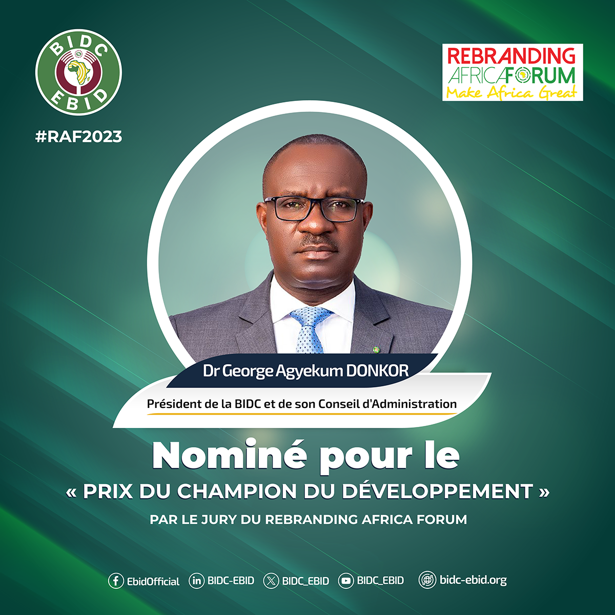 Lomé, 11 septembre 2023 Le Président du Conseil d’administration de la Banque d’Investissement et de Développement de la CEDEAO (BIDC), Dr George Agyekum Donkor a été nominé pour une nouvelle distinction honorifique internationale qui représente un exploit historique : le Prix du Champion du Développement décerné par Rebranding Africa Forum. Le prix sera décerné lors d’une cérémonie spéciale à Bruxelles, en Belgique, dans le cadre de la 9ème édition du forum en octobre 2023.
