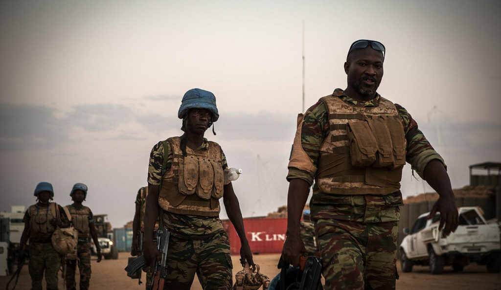 Ce sont des Casques bleus guinéens de la Mission multidimensionnelle intégrée des Nations Unies pour la stabilisation au Mali (MINUSMA), basés dans la ville instable de Kidal, dans le nord du pays. Le cœur du désert du Sahara est constamment menacé par des forces hostiles.